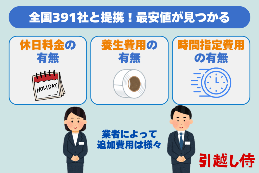 業者によって、追加費用がかかるところとかからないところ、休日料金や加算のポイントは異なります。