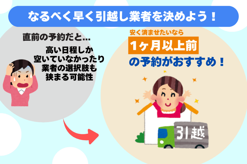 早めに予約を行うと、安く引越しできる業者・希望の日時に空いている業者を選ぶ余裕が生まれます。