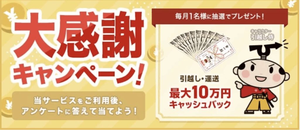また、『引越し侍』では、利用後にアンケートに回答すると最大10万円もらえるキャッシュバックキャンペーンも開催しているので、さらにお得に引越しができるチャンスまであります!