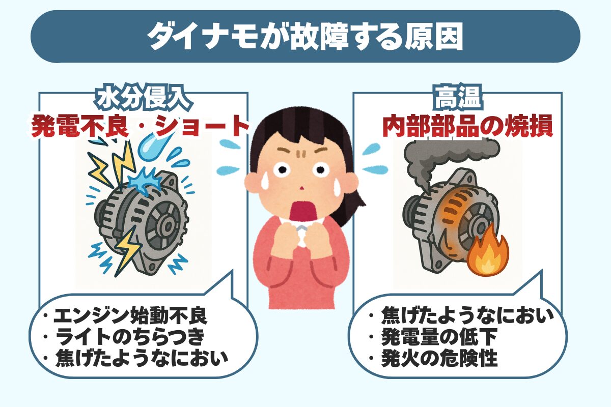 ダイナモはエンジンルーム内に設置されており、水分や熱の影響を受けやすい部品です。