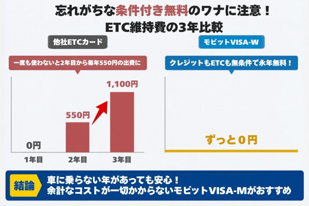 クレジットカードもETCもダブルで永年無料で、余計なコストがかからないのは、「モビット VISA‑W」の嬉しいポイントです!