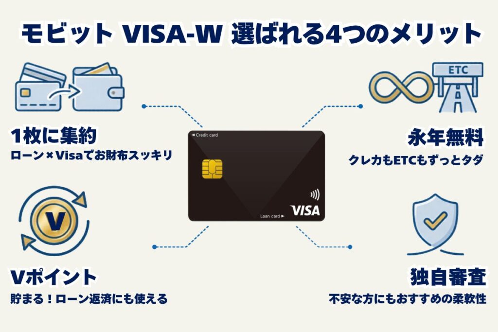 「モビット VISA‑W」は、カードローン機能とVisaのクレジットカードが1枚に集約された、いざという時にも安心のカード。