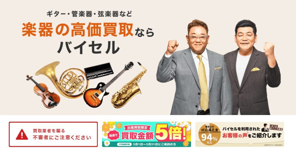 日本全国で出張買取可能ですので、自宅に眠っている楽器や不用品がある方は、「バイセル」に相談してみましょう。