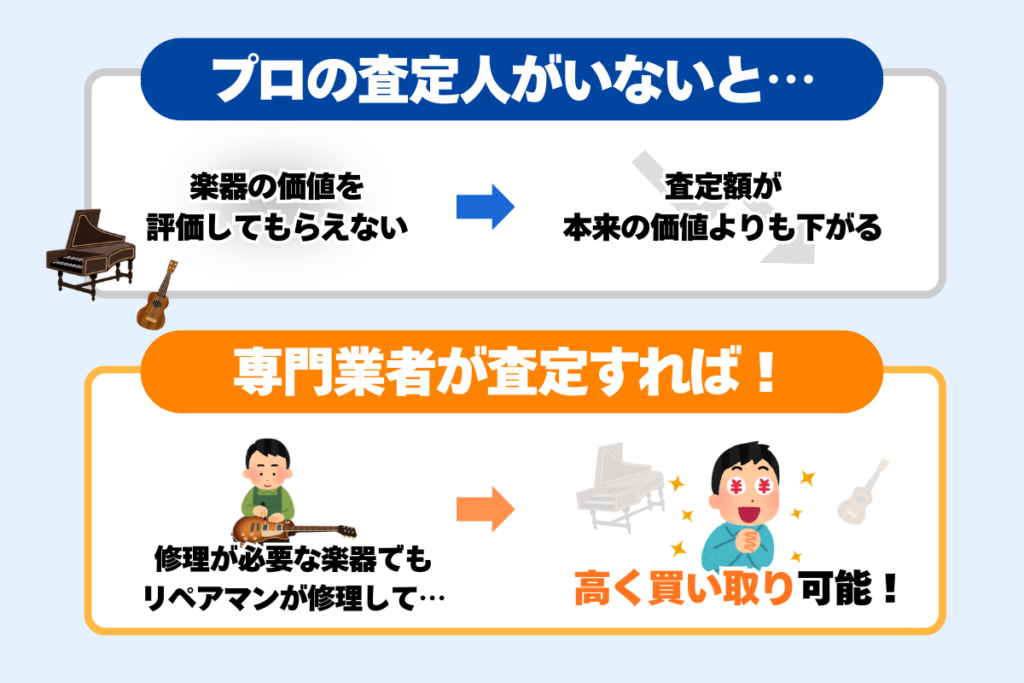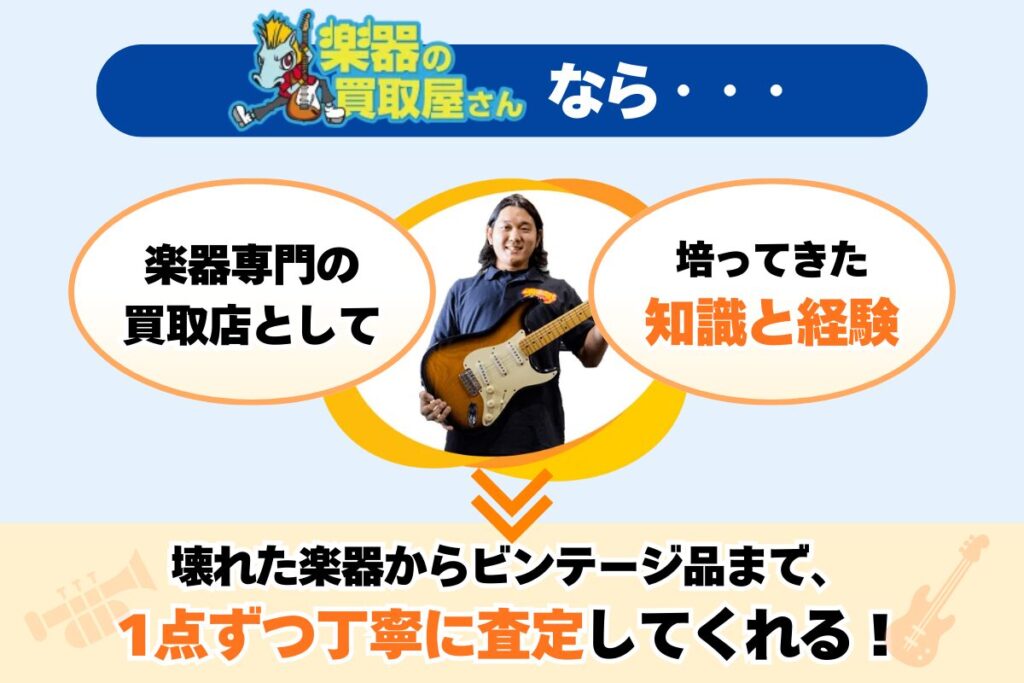 楽器にあまり詳しくない買取業者に査定を依頼すると、楽器のメーカーや型・年式など表面的なデータのみで判断されてしまうことも…。