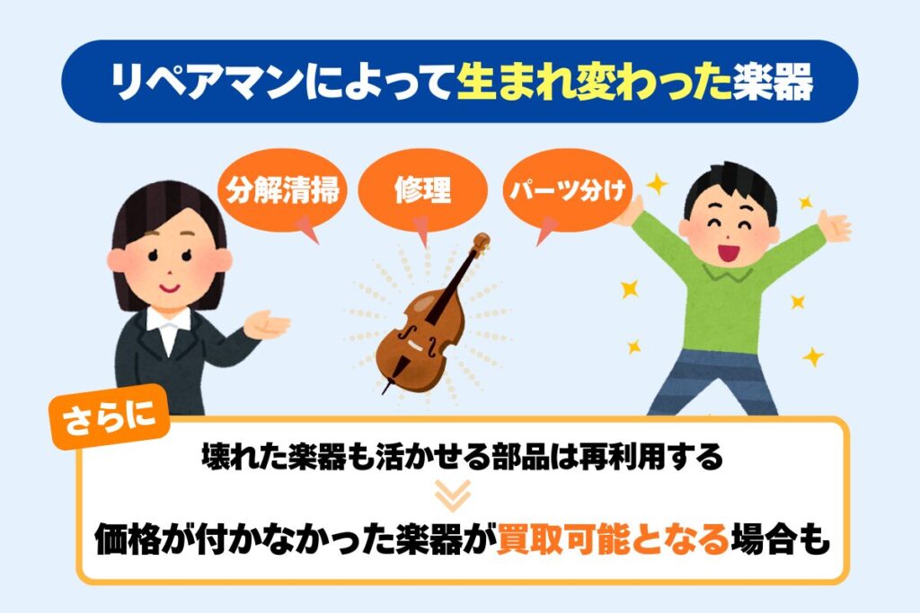 しかも、楽器の修理楽器の修理を担当するリペアマンがいる買取店なら、外部修理が必要ない分高く買い取ってもらえるというメリットもありますよ。