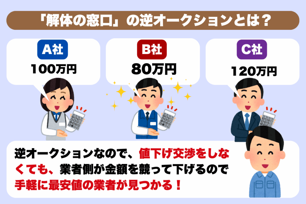 解体の窓口で最安値が引き出せる理由は、「逆オークション」型の入札方式。