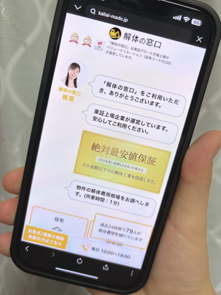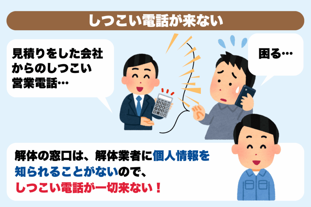解体の窓口は、解体業者に個人情報を知られることがないので、しつこい電話が一切来ないんです!
