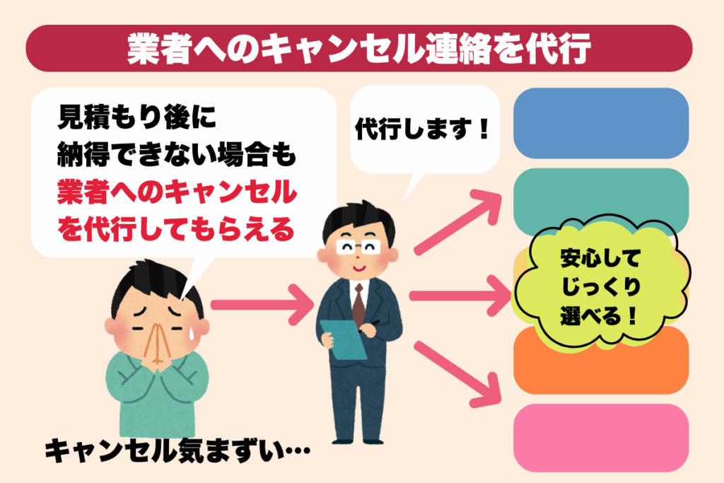 それだけでなく、見積もり後に納得できない場合は、業者へのキャンセル連絡を代行してもらえるのも嬉しいポイント。