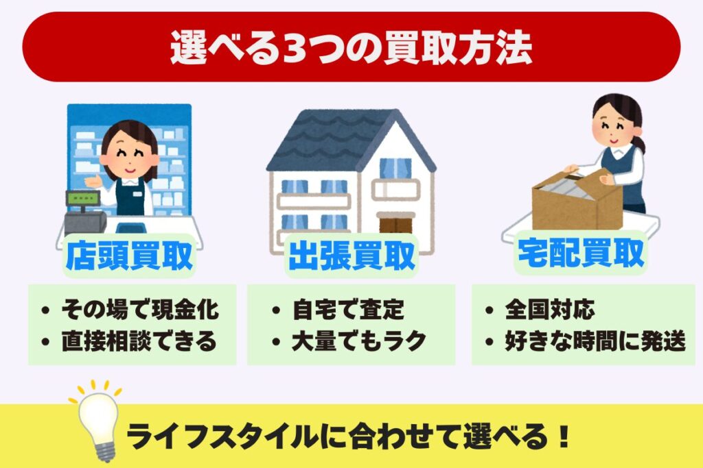 買取方法は、主に店頭買取と出張買取、宅配買取の3つがあります。