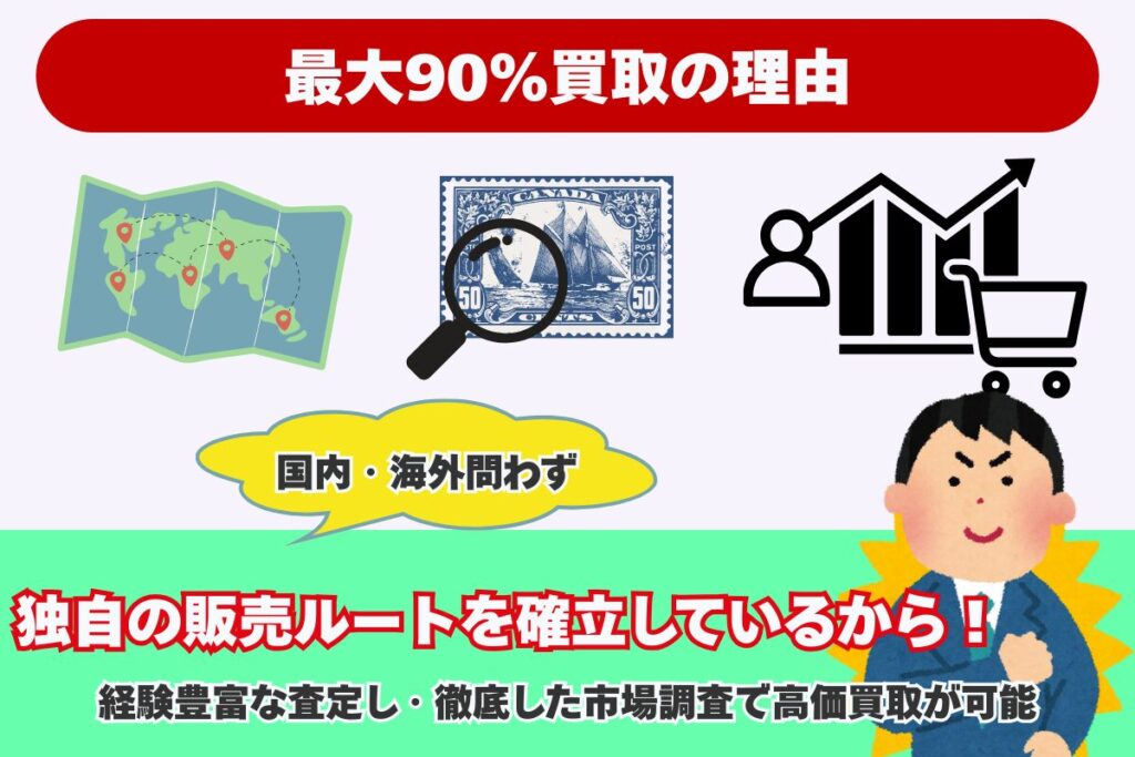 「まねきや」が切手買取率最大90%を実現できる大きな理由は、国内・海外問わず独自の販売ルートを確立しているから。