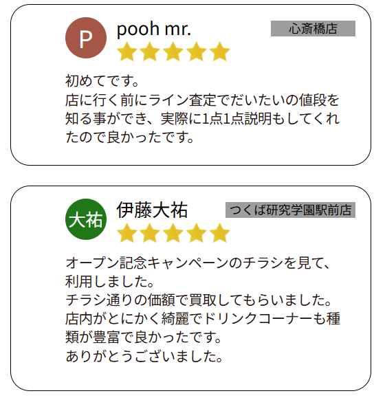 ![]() 迅速な査定対応 その場で現金買取 | ![]() 来店予約不要 最短5分で査定 | ![]() 混雑時は問い合わせ回答に1-2日かかる場合もあり |