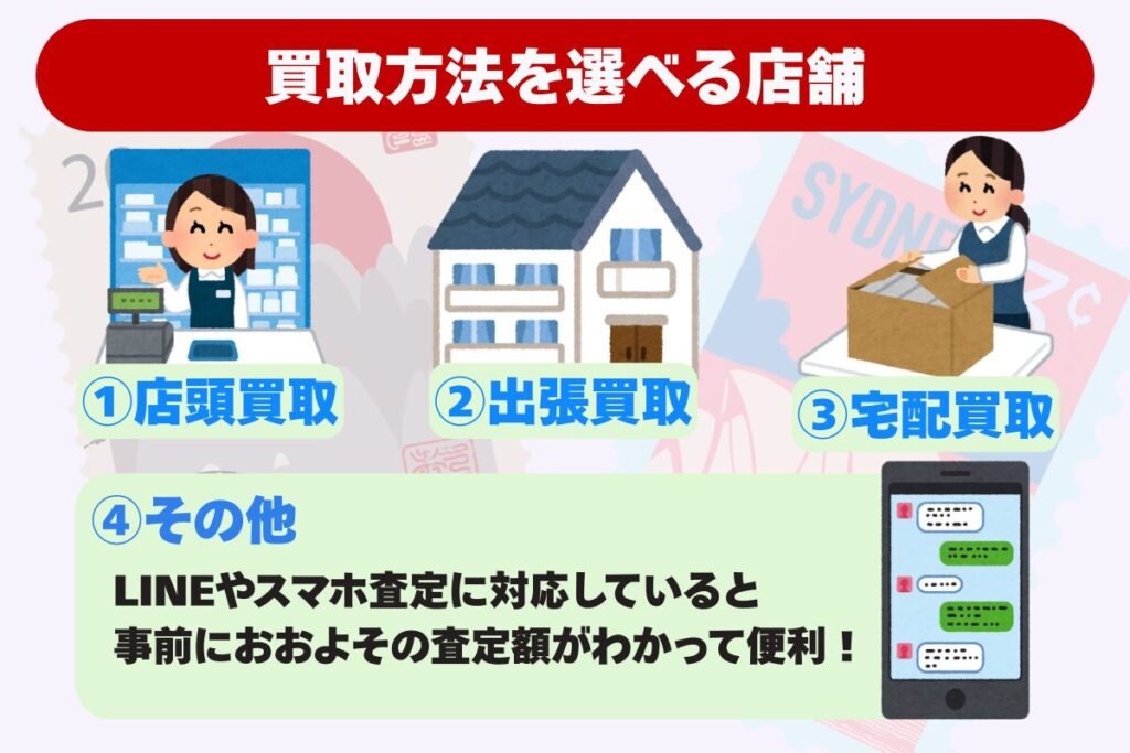 買取方法が豊富なら、仕事や家庭の状況で店舗に足を運べなくても、切手の買取依頼が簡単にできます!