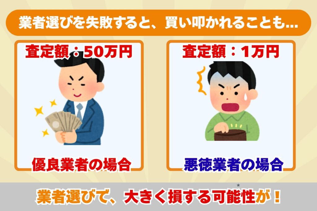 買取業者選びを間違えると、相場より安く売却してしまうことも。
